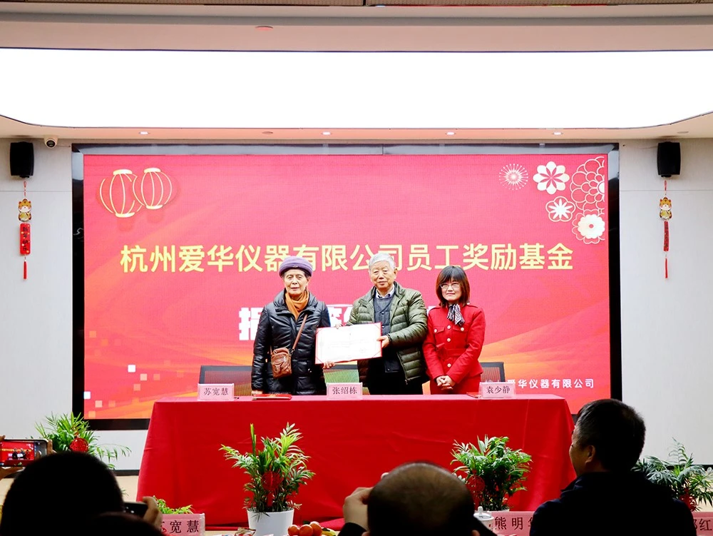 会议上公司创始人张绍栋、苏宽慧夫妇捐资1000万设立“杭州爱华仪器有限公司员工奖励基金”,该笔基金将交由公司工会运作和管理,基金收益用于奖励爱华仪器及控股子公司的杰出员工。