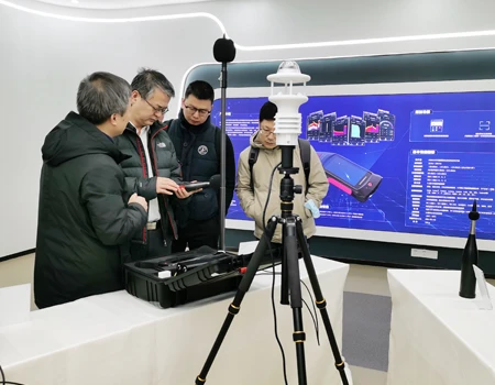 毛玉如副站长一行首先参观了公司户外试验区噪声源追踪、定位、识别系统,测试人员现场演示了噪声定位、鸟叫虫鸣识别等公司研发的最新科技产品。熊明华总经理介绍了公司参与全国“宁静小区”建设试点工程的实际成效和经验。
