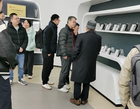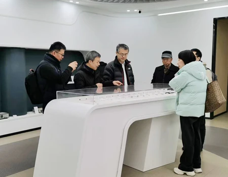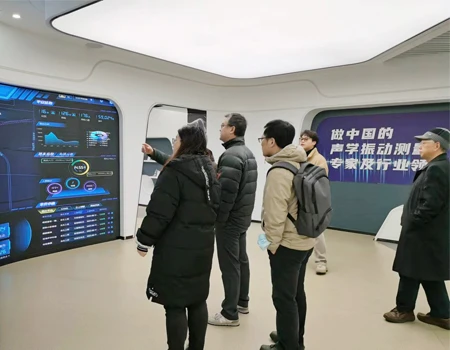 在公司展厅,领导一行参观了爱华仪器的发展史和产品陈列墙,详细了解了公司测量电容传声器的生产情况,以及新款的AWA6292多功能声级计销售状况。