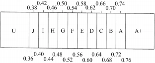 简单来说,语音传输指数是衡量语音传输质量的一个指标,该参数可以较为全面反映混响时间、信噪比和回声等对语言清晰度的影响,并且考虑了系统失真、心理声学效果(掩蔽效应)等因素。它的值范围为0~1,值越大说明清晰度越好。好的扩声系统即使用在声学条件较差的环境也能达到0.45到0.65的结果,而在声学环境较好的场所,能达到0.70至0.90。更直观的例子是,一间优秀的录音棚内,从麦克风到监听音箱之间典型的STI值能达到0.90至0.97。图1所示为评定等级,图中字母为等级名称,上面数字代表该等级的STI中心值,下面数字代表该等级的STI边界值。A+是极高的语言可懂度,A、B和C是高的语言可懂度,D是较好的语言可懂度,E是高品质的扩声系统,F是较好品质的扩声系统,G是语音报警系统的目标值,H是语音报警系统的正常下限,I是有限的语言可懂度,J和U是STI值太低,不宜用于扩声系统。