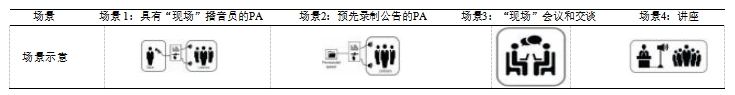 需要STI测试的可能场景有4种,如表3所示,其中确定了传输通道、说话者和收听者。场景1与场景4基本相同,都是测量时说话者通过传声器到扩声系统,再由扬声器系统发声,只是场景1中说话者与听者不在一个房间(场所),而场景4中说话者与听者同在一个房间(场所),所以下面分3种场景进行介绍。在STIPA测试期间,所有的说话者都被STIPA测试信号源所取代,所有的听者(和听者的位置)都是所用STIPA分析仪的测试位置。