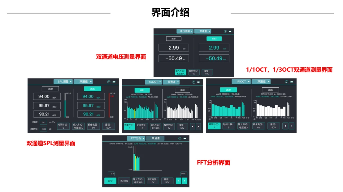 AWA5812型测量放大器是我公司最新研制成功,采用数字信号处理技术的通用型实验室声学测量仪器,具有多功能、双通道输入、动态范围大、精度高、稳定性好、操作简单等优点。可同时测量两个通道的交流电压、计权声压级等多项指标,还具有FFT分析、1/1 倍频程和1/3 倍频程滤波器分析等功能。集交流数字电压表、精密声级计、FFT分析仪、1/1倍频程和1/3倍频程分析仪等多种功能于一体。另外,仪器配备5寸带触摸功能的彩色显示屏,屏幕分辨率为800×480,能实时显示多种测量结果,用户可通过触摸屏对仪器进行操作,使用简单方便。